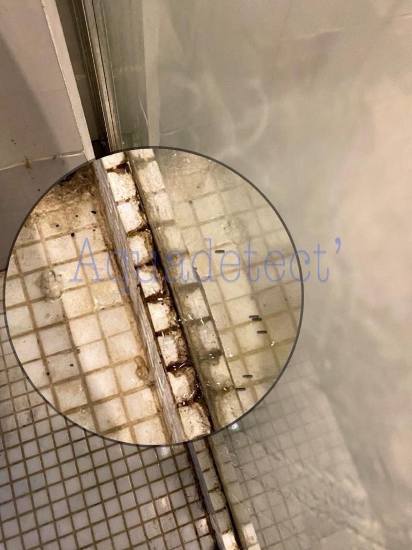 Nous continuons nos investigations au 2ème étage, nous effectuons un test en envoyant des projections d'eau de la douche vers le bas de la paroi afin de vérifier l'étanchéité de celle-ci, fuite abondante constatée.